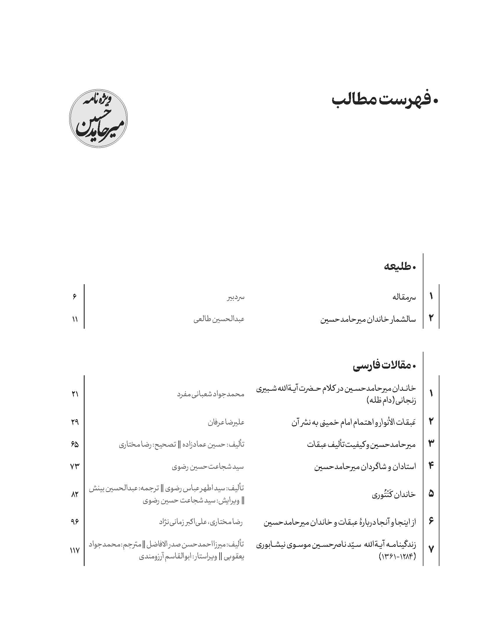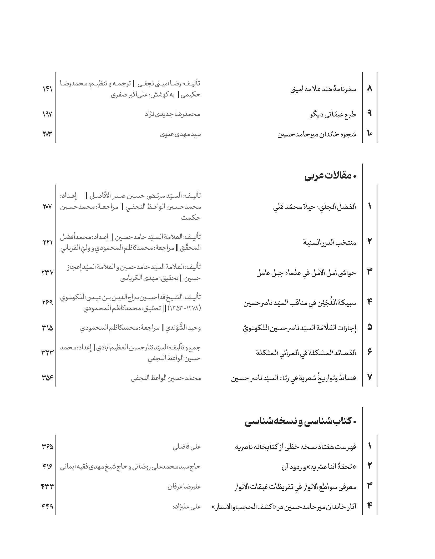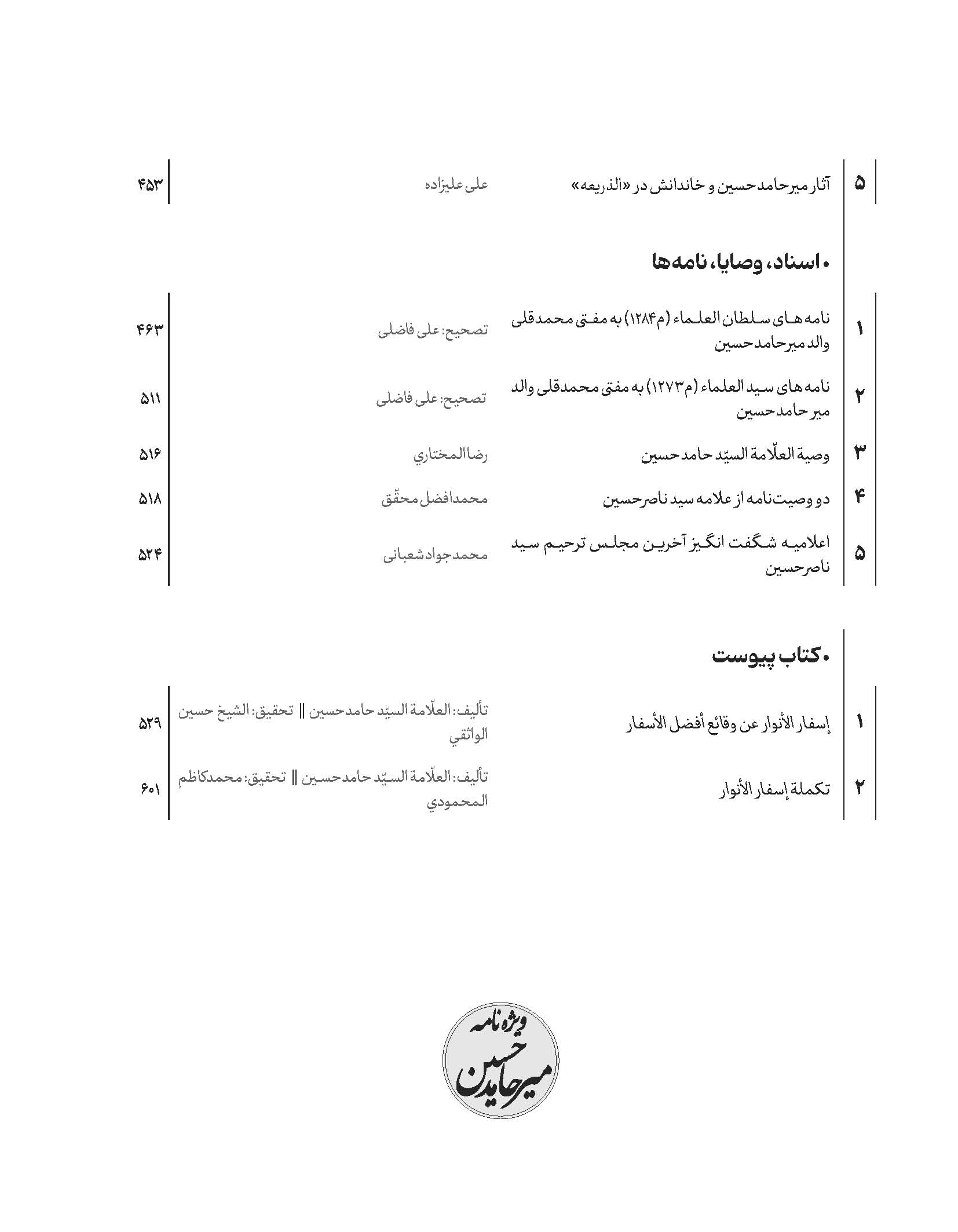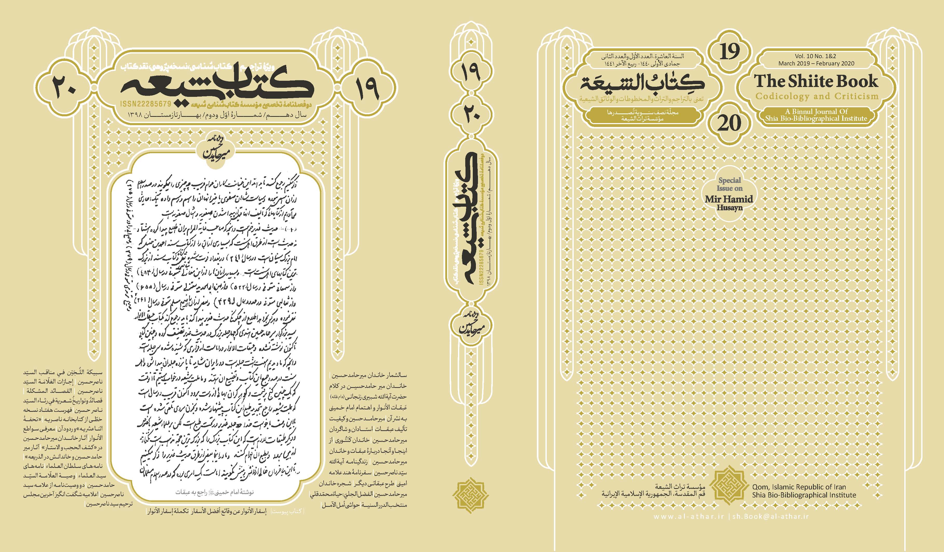 شماره ۱۹-۲۰ دو فصلنامه کتاب شیعه که به تازگی لباس طبع پوشیده، همهی صفحات خود را به مطالب متنوعی دربارهی علامه میرحامد حسین و خاندانش اختصاص داده است. این ویژهنامه در ۶۰۸ صفحهی رحلی، در حدود سی عنوان نوشتار در پنج بخش از بزرگانی نظیر امام خمینی، علامه امینی، علامه روضاتی، و آیةالله شبیری، شاملِ: اهتمام امام خمینی به نشر عبقات، سفرنامه حج علامه میر حامد حسین، فهرست تفصیلی هفتاد نسخه خطیِ کتابخانه ناصریه، وصیتنامهی علامه میر حامد حسین و فرزندش سید ناصر حسین، اجازات سید ناصر حسین و... است. فهرست این شماره در تصاویر ضمیمه (سه تصویر پایین متن)، آمده است.